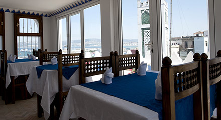S’invitant à perte de vue sur le port et la baie de Tanger, la salle du restaurant semble